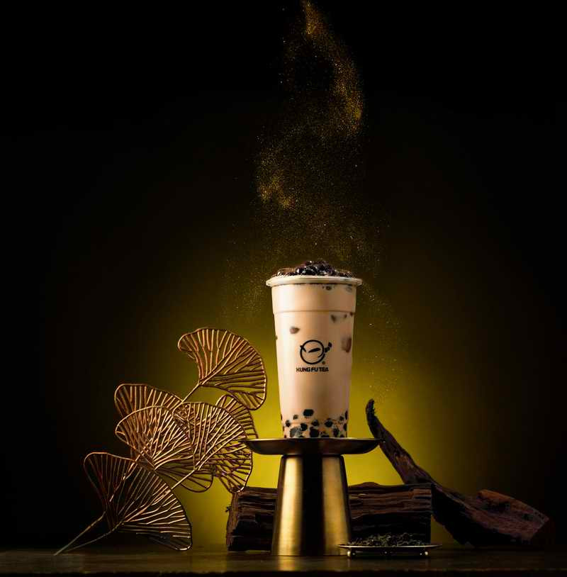 ▲聯名推出限定「黑霸烏龍奶」創造強烈主題氛圍。(圖/KUNG FU TEA功夫茶提供)