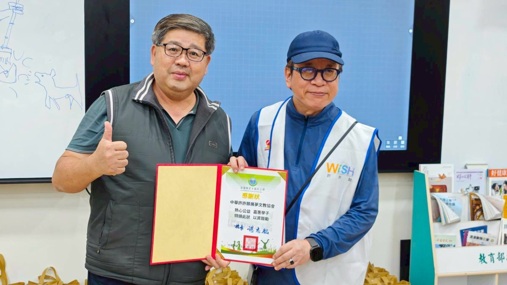 育才國小校長諶志銘 致贈感謝狀 許許願文教協會 許懷泉理事長(右).(圖/許許願提供)