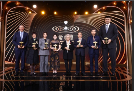 第20屆愛心獎得主:(左起)Peggy Dulany(美國洛克菲勒家族第四代傳承人)、陳黃穗(香港小童群益會兒童之家)、何芷韻(香港保良局)、陶斯亮、梁見後(美國美超微公司SMCI.US董事長)、王金平(台灣癌症基金會董事長)、魏文斌(中國宋慶齡基金會)、姚明(姚基金).