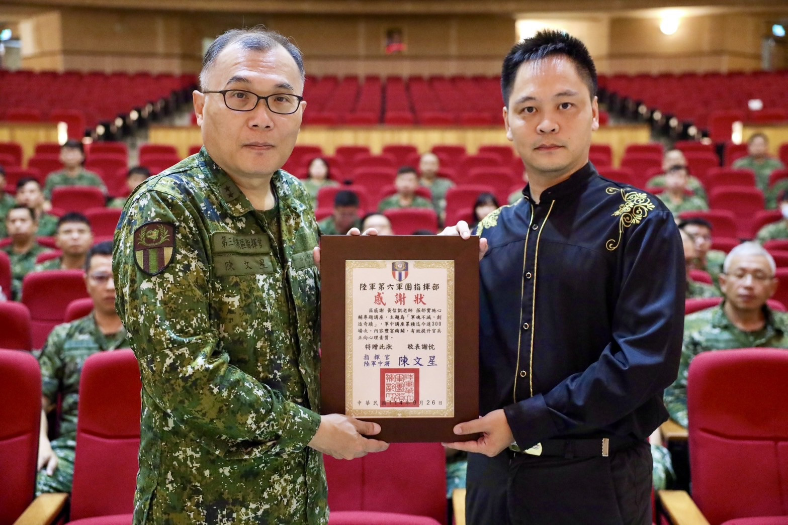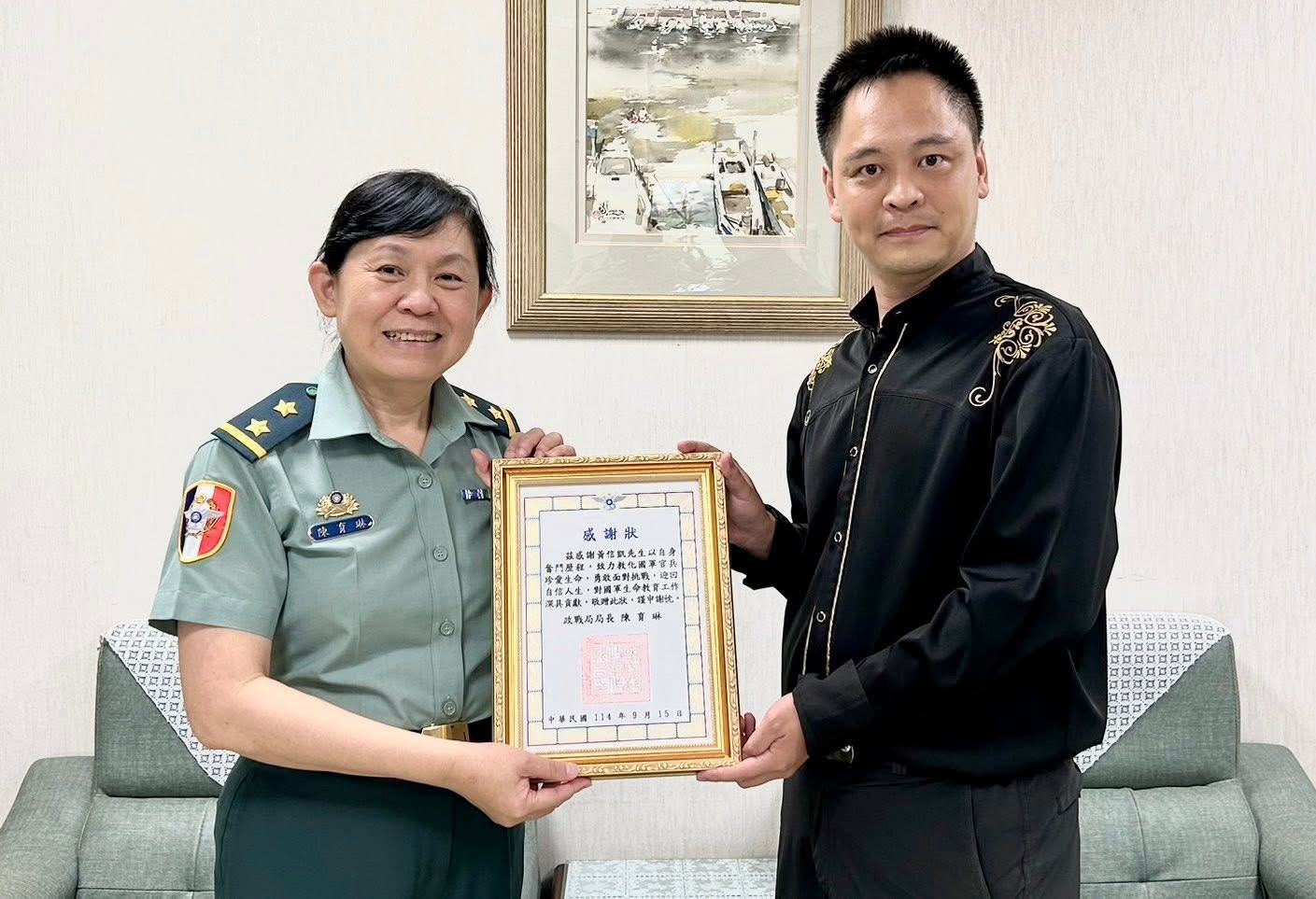 照片說明:國軍心輔講師黃信凱,完成第三百場心輔講座,政治作戰局陳育琳局長頒發感謝狀。