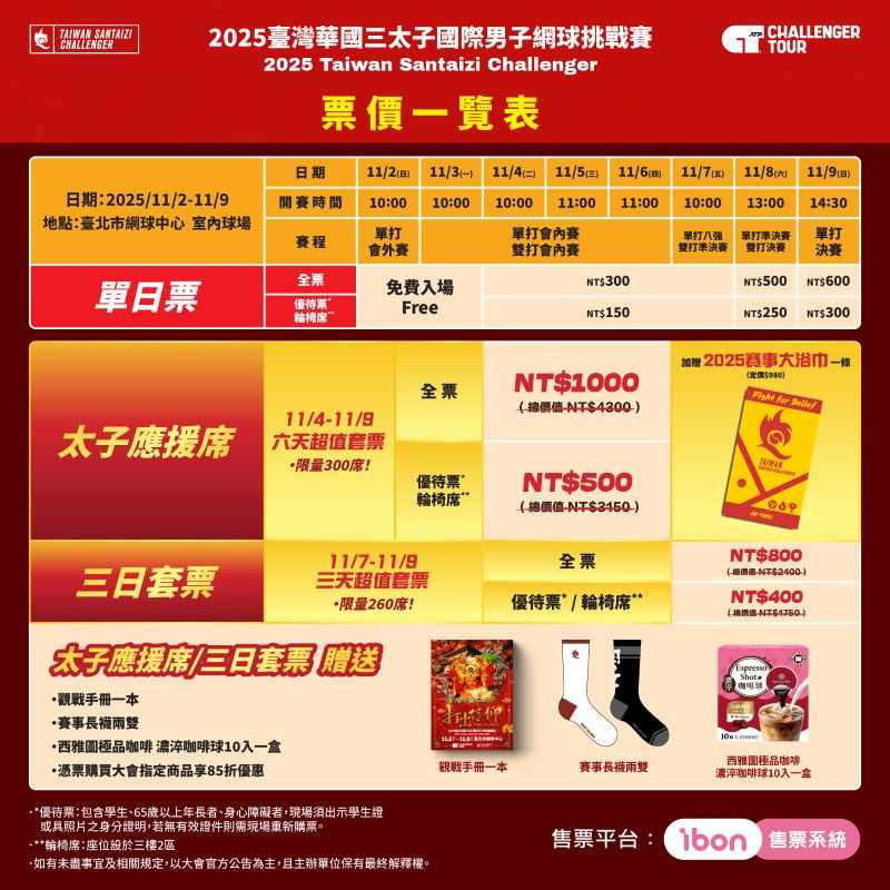 賽事門票定於10月14日中午12點在ibon售票系統全面開賣(https://ibontw.com/25_TCP)。票價部分,11月2日及3日免費開放入場觀賽;11月4日至7日會內賽期間,全票300元、優待票150元;11月8日單打準決賽和雙打決賽,全票500元、優待票250元;11月9日單打決賽,全票600元、優待票300元。外縣市球迷憑賽事門票可享高鐵票加購優惠,詳情請參考ibon票劵說明。