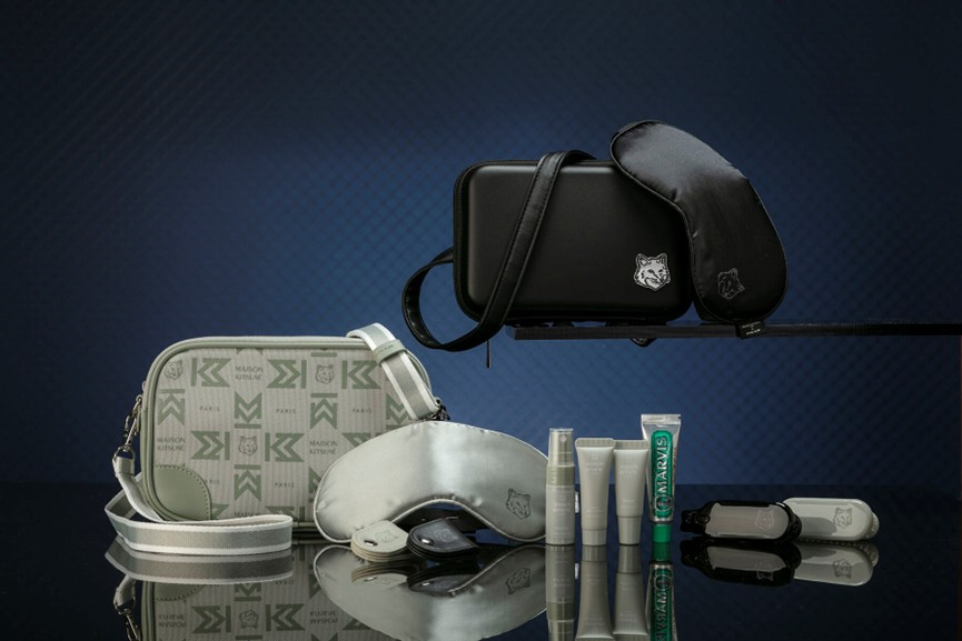 長榮航空機上服務用品不斷推陳出新,現行與時尚潮牌Maison Kitsuné專屬合作,完美契合長榮航空致力於提供國際化服務、連結全球旅客的品牌定位,首次將皇璽桂冠艙過夜包與睡衣使用同一個品牌設計,Maison Kitsuné的品牌經典元素為狐狸圖騰,睡衣以其為設計亮點,上衣繡有精緻品牌狐狸頭Logo,褲身則印有標誌性Monogram 圖騰,全套睡衣選用50%環保材質 rPET 布料製成,彰顯品牌獨特風格與細膩質感。