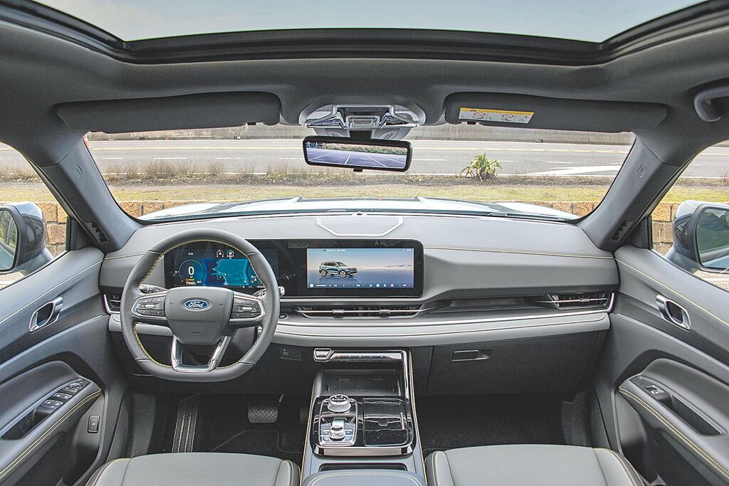 雙12.3吋一體式懸浮車艙數位螢幕,上方為電子後視鏡,並將PM2.5車室空氣微粒監測系統列為標配。(陳大任攝)