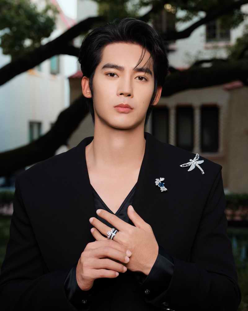 于適胸前兩枚胸針相映成趣,為整體造型注入盎然生機與敘事感。