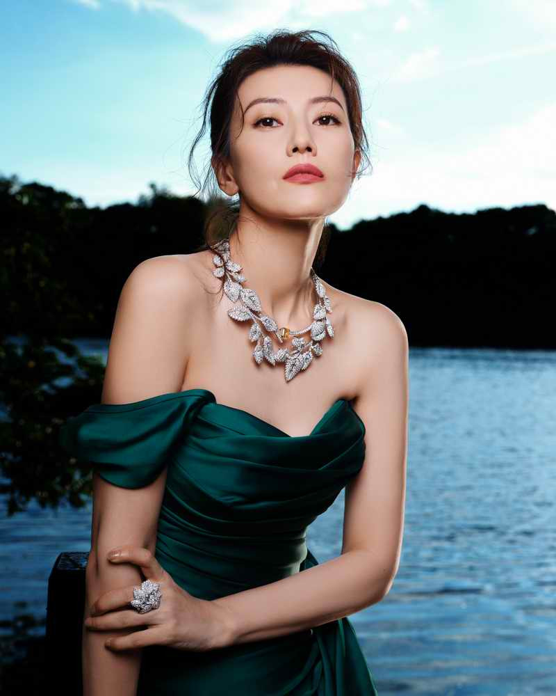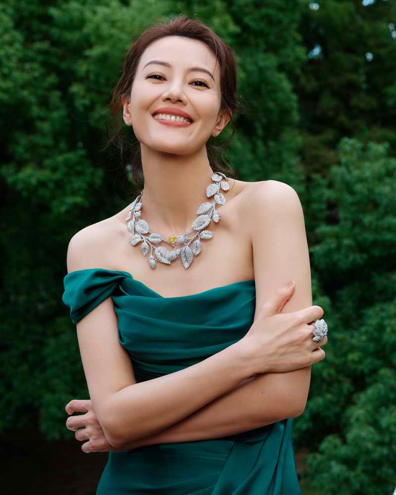 高圓圓配戴Wild Rose 系列套鏈及戒指,一枚艷彩黃鑽於頸間重現野玫瑰的絢麗光彩。