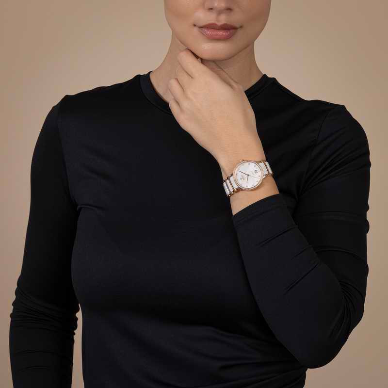 在時間的軌跡裡,有些設計不需喧囂,卻能在舉手投足間留下難以忽視的印記,極致美學從不僅止於外觀,而是將工藝、材質與佩戴體驗融為一體。Rado 瑞士雷達表以鑽石的璀璨光彩推出全新 Centrix 晶萃系列高科技陶瓷鑽錶。錶圈上鑲嵌的鑽石,宛如時光的刻度,分分秒秒皆閃耀著純粹光芒;珍珠母貝的自然流紋,則以不同角度折射光彩,如同生命映照每一個個體閃閃發光的瞬間。透過兩種錶徑、兩種氣質,將優雅、現代與自信的語言細膩詮釋。Centrix 晶萃系列鑲鑽腕錶承載的,不僅是時間的精確運行,更是一種對生活品味的詮釋方式。錶殼與錶帶以玫瑰金色調為主軸融合高科技陶瓷所帶來的細膩觸感,賦予腕錶溫潤而輕盈的配戴體驗,這些細節不只服務於美,更訴說著配戴者對生活美學的堅持。