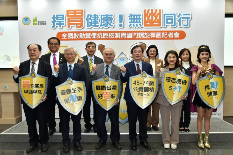 「捍胃健康齊啟動」呼籲儀式-前排左起臺灣醫院協會李飛鵬理事長、臺灣消化系醫學會李宜家醫師、臺大醫學院吳明賢院長、衛生福利部莊人祥常務次長、國民健康署沈靜芬署長、宣導大使唐玲,後排左起中華民國醫師公會全國聯合會王俊傑召集委員、臺灣家庭醫學醫學會施錦泉醫師、國民健康署林莉茹副署長、國民健康署癌症防治組徐翠霞科長.(圖/主辦單位提供)