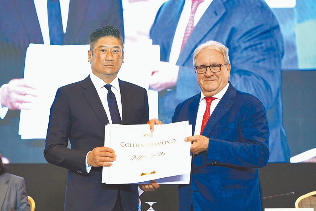 亞洲棒總會長辜仲諒(左)於WBSC會員大會獲頒「金鑽榮譽獎章」,表彰其推動亞洲棒球運動之貢獻與成就,也成功連任WBSC執行副會長。 (亞洲棒球總會提供)