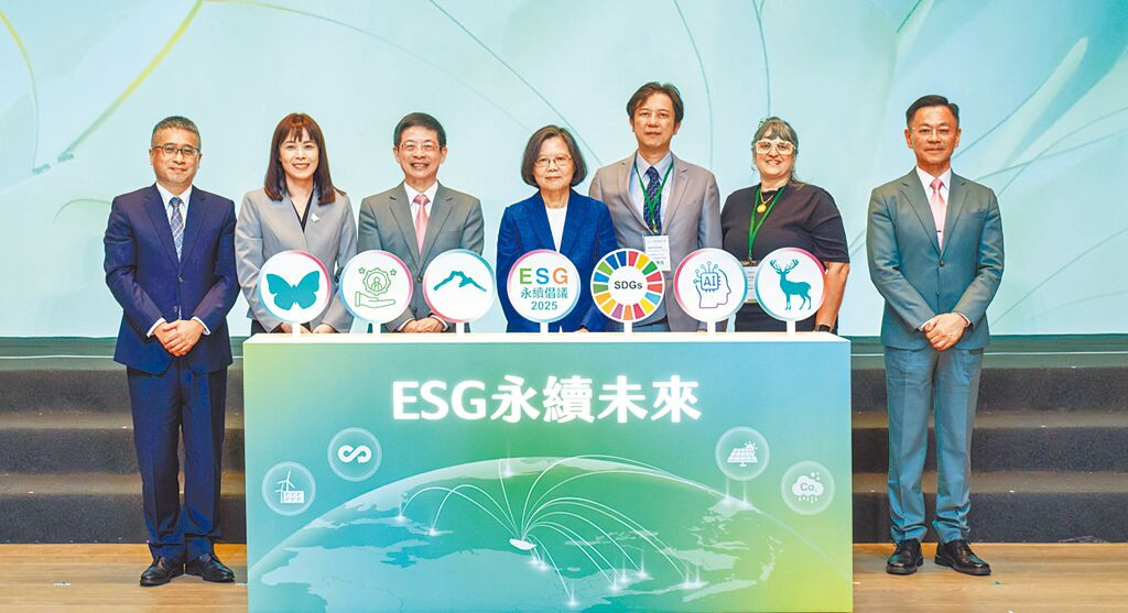 前總統蔡英文(中)、玉山金控董事長黃男州(左三)、金管會副主委陳彥良(右三)共同參與「玉山ESG永續倡議行動」。(玉山提供/黃琮淵台北傳真)