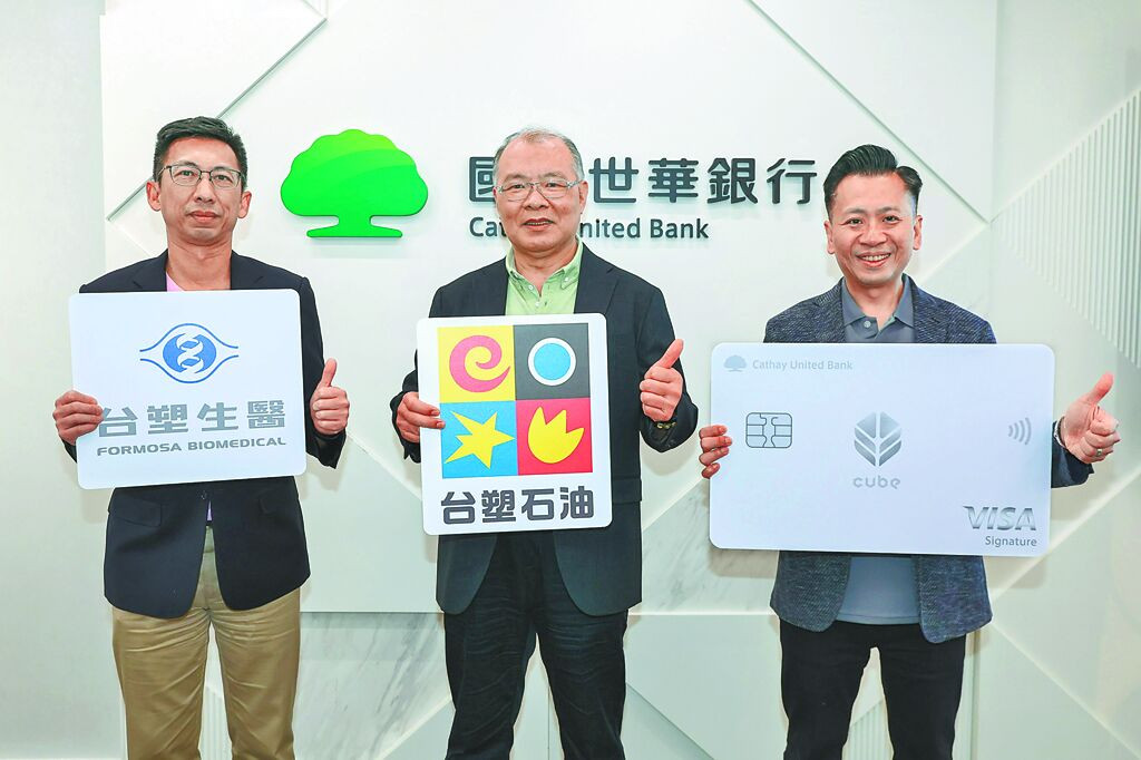6月1日起台塑聯名卡將換發CUBE信用卡,卡友權益全面升級。圖右至左為國泰世華銀行副總經理梁明喬、台塑石化資深副總經理陳和奇、台塑生醫副總經理傅榮輝。(國泰世華提供╱洪凱音台北傳真)