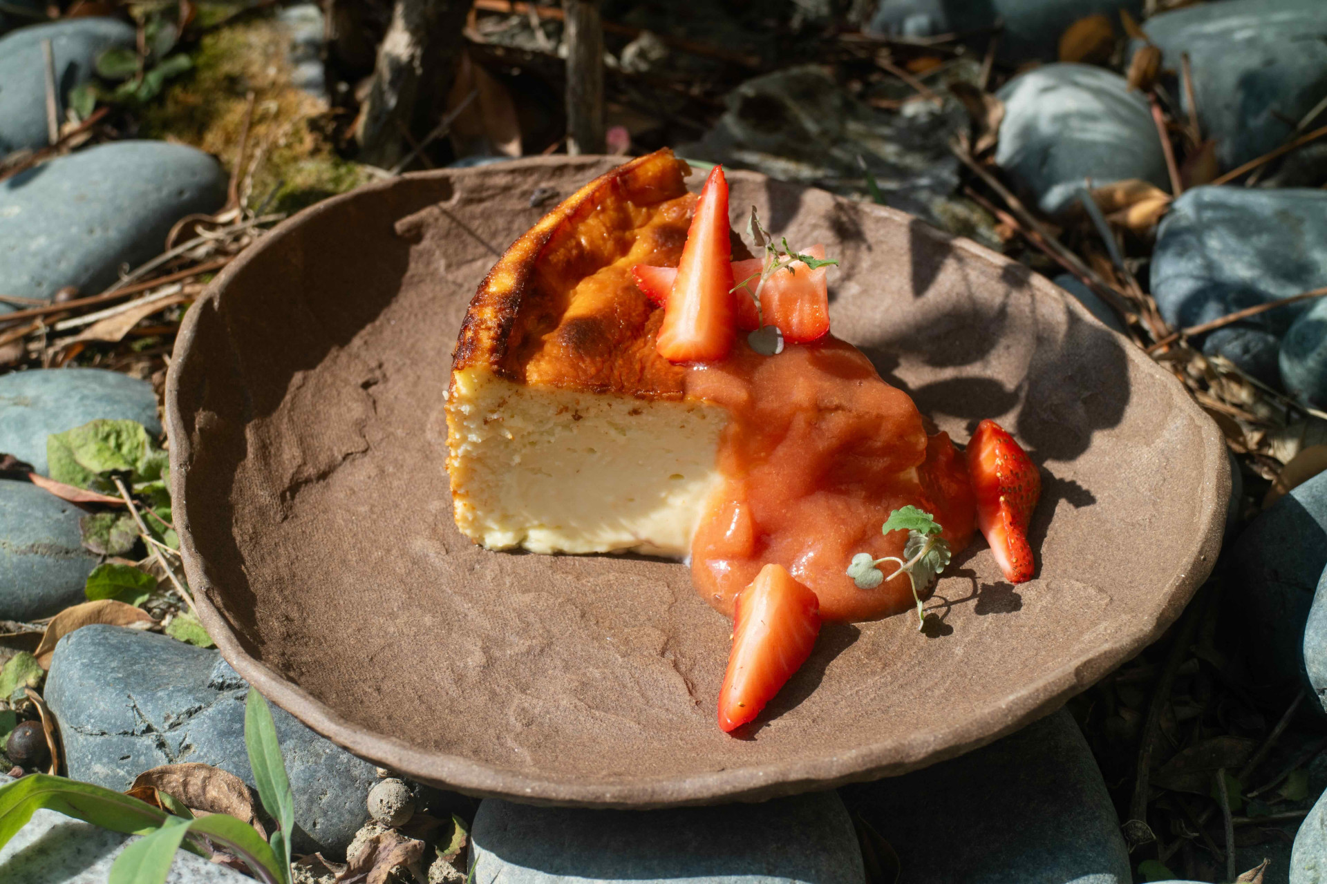 源自西班牙聖塞巴斯提安(San Sebastián)的熱情,在慕舍的綠地庭院中被賦予了更有趣的驚喜。主廚在濃郁的Cream Cheese中,巧妙藏入了一絲「藍紋起司」的叛逆氣息,讓蛋糕在醇厚甜美中,隱約躍動著微微鹹香。佐以鮮製果醬與新鮮莓果,這是甜點,更是一場關於味覺平衡的優雅呈現。