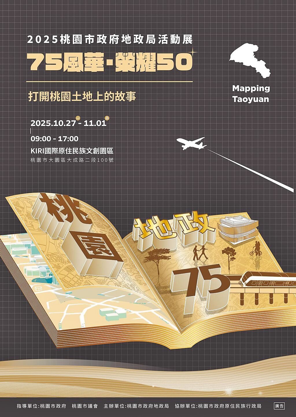 桃園市地政局「75風華‧榮耀50」活動展,27日起在KIRI國際原住民族文創園區登場,以精準測量、智慧地政、宜居桃園與考古遺址等核心主題打造4展區,結合科技互動、影像資料與在地故事,以沉浸式體驗帶領民眾穿越時空,看見桃園土地治理半世紀的智慧轉型。