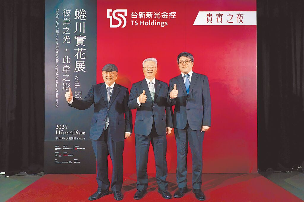 台新新光金控舉辦《蜷川實花展 with EiM:彼岸之光,此岸之影》貴賓之夜。圖為台新銀行文化藝術基金會董事長鄭家鐘(左起)、台新新光金控總經理林維俊、聯合數位文創董事長李彥甫。(台新新光提供/黃琮淵台北傳真)